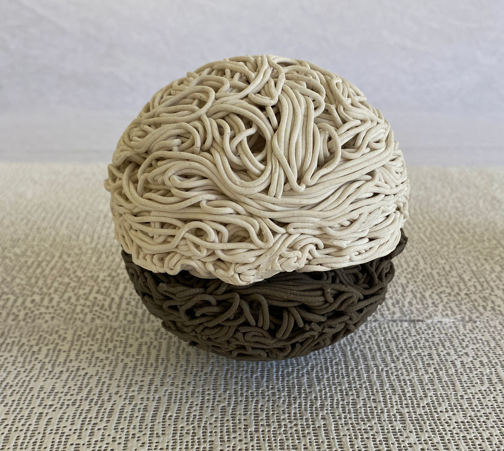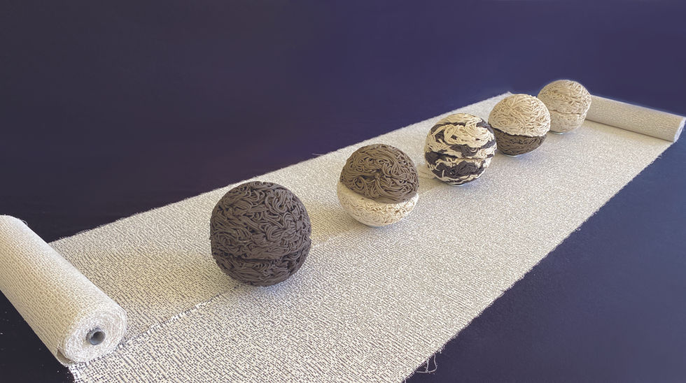 The work presented in halves of spheres shows the human being's capacity for transformation, a possibility to change his mind and make new choices. The plaster mat in different directions shows that we can shape the way to go. This is called free will. We are not doomed to a single destination. We are dual and we may have the choice of walking the path of Light or Shadow. With these choices we have different experiences. That is life, which is shaped according to our choices and decisions.